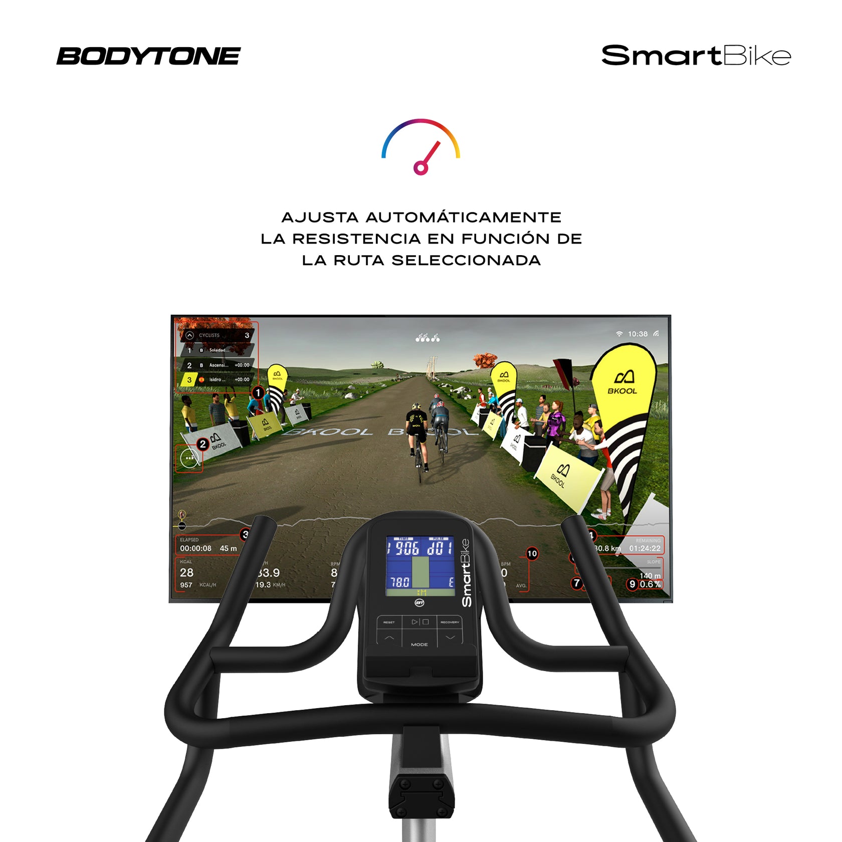 Esta bicicleta de Ciclo Indoor destaca por su diseño confeccionado desde estudios de biomecánica y ergonomía. Su conectividad Bluetooth te permitirá crear sesiones de entrenamiento smart y conectarte a plataformas de entrenamiento virtual como Volava, Bkool, Zwift, Onelap, Kinomap o Mybodytone. Además, podrás disfrutar de videos y música para crear un ambiente motivador y cuando te conectes a apps simuladores de ciclismo, la bicicleta podrá ajustar automáticamente la resistencia en función de la ruta, para lograr una verdadera experiencia inmersiva.